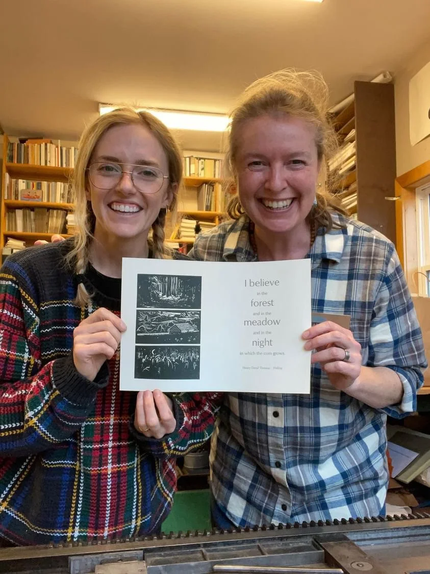 Phoebe Todd-Parrish (left) is an awesom printmaker and teacher from Toronto. She and I had the pleasure of collaborating on the demonstration print during the open house portion of the Wayzgoose. She created a linocut image to go with a quote by Henry David Thoreau, and we guided participants in the actual printing of this keepsake. What fun!