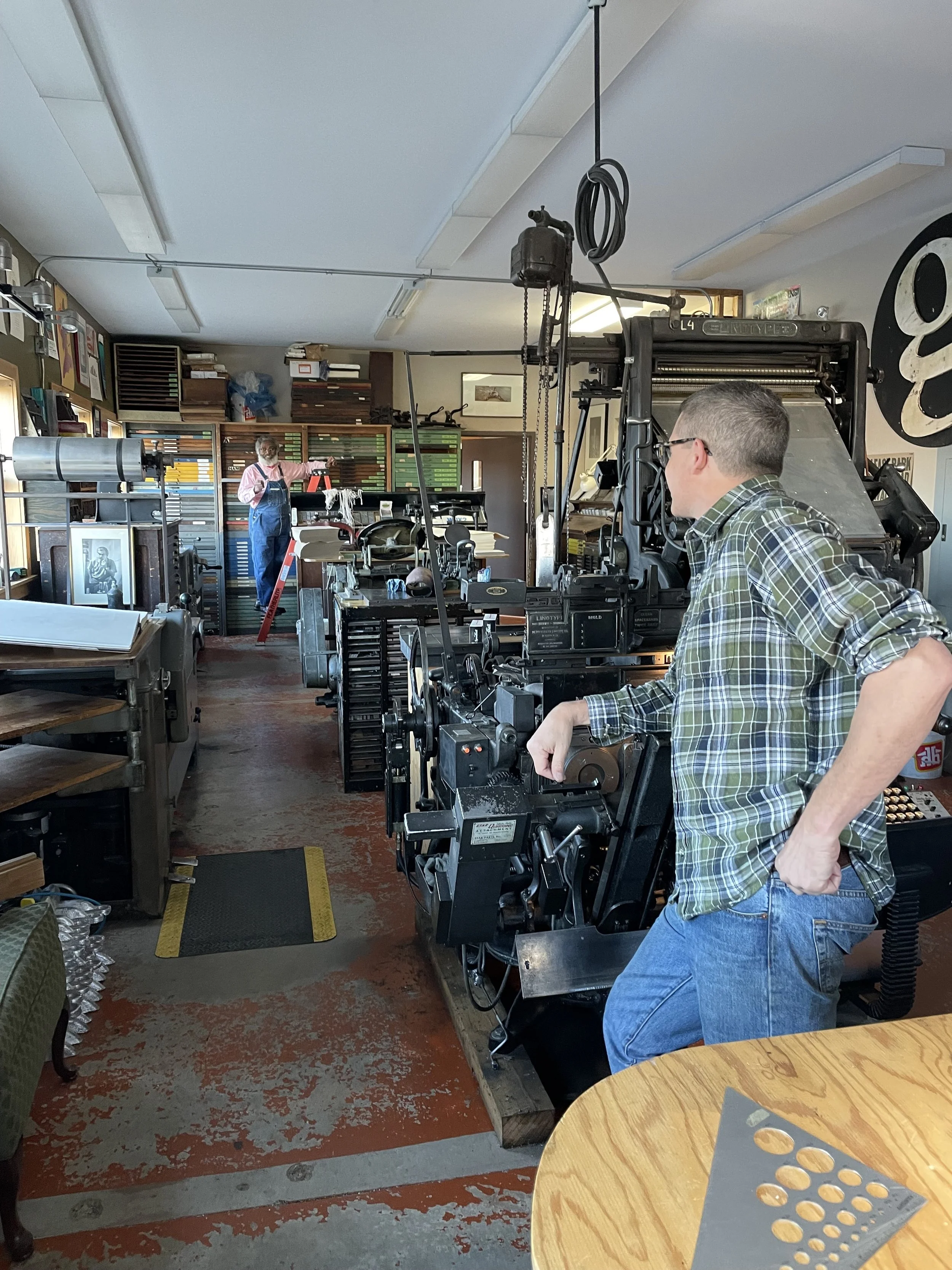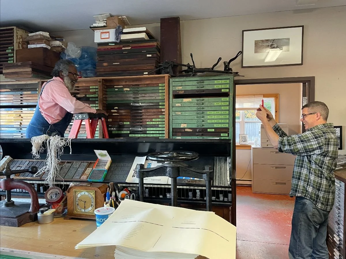 Amos (L) and Andrew (R) talkin’ shop in the Gaspereau Press print shop. Andrew is leaning on the Linotype, while Amos is rummaging through the cases of wood type.
