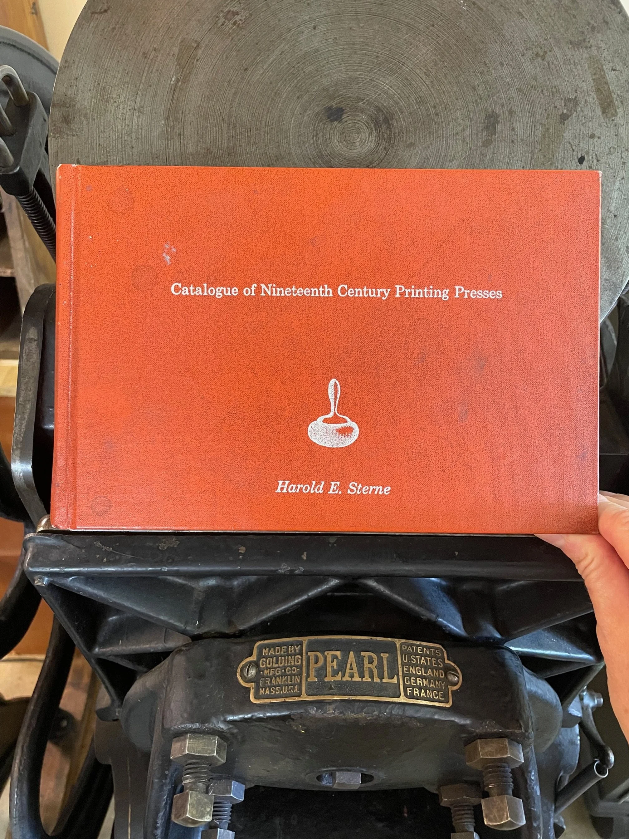 For an almost entirely visual guide to just the 19th century era of printing press design and manufacture, Harold Sterne’s Catalogue (published by Ye Olde Printery, Cincinnati, 1978) is a delightful presentation of engravings and period advertisements for letterpress machines. Sterne (1929-2010) was a co-founder of NA Graphics (which continues to this day its founding mission to provide printing supplies to the community) and he helped to save crucial historical documents and inventories for the Vandercook and Kelsey companies. In the Catalogue, each section begins with a brief 2-page introduction to a category of press: cylinder, hand, lithographic, platen, and rotary presses. The rest of the chapter is devoted to full-page illustrations chronicling the varying constructions of these “ornate monsters” from a dizzying array of manufacturers. A final chapter presents a selection of devices and tools that were also part of the 1800s printing trade, such as steam engines, paper dampening contraptions, and machines for casting and finishing printing plates. Last but not least, Sterne’s compilation is a fun window into not just presses, but also 19th century ad design and type design. Warning: this 380-page book is a fascinating visual rabbit-hole, from which you might not emerge in time for dinner!
