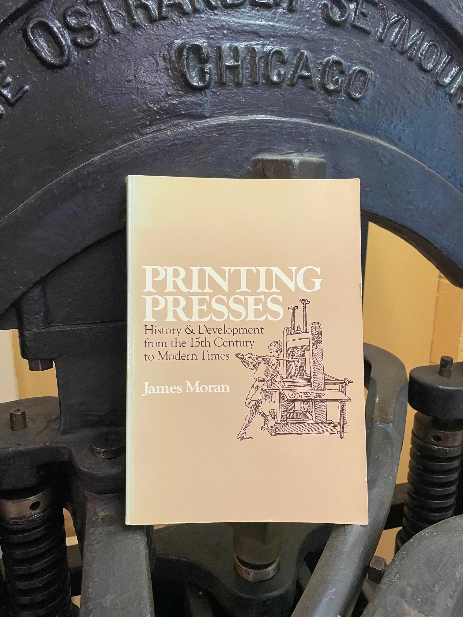 First published in 1973 by the University of California Press, James Moran’s copiously illustrated introduction to the history of the relief (or letterpress) press and machine in Europe and America — the five hundred years of innovation and development that stretched from the mid-1400s to 1940 — was the most concise and comprehensive study up until the late-20th century. Since then, further historical research has refined our understanding of especially the earliest European printing, and there are other very important treatments of the much-earlier printing techniques that developed in China and Korea, yet Moran’s 250 pages is still a reliable survey of its subject. Not only does he get down to the literal nuts and bolts of printing press design and function, era by era, but he also helpfully locates those developments within their own unfolding cultural, industrial, and economic realities. From the first cast-iron versions of Gutenberg’s wooden handpress to jobbing platens and on to rotary cylinders, this is pretty engrossing (and well-written) history for those of us who admire the machines that made (and still make!) an indelible impression on the world.