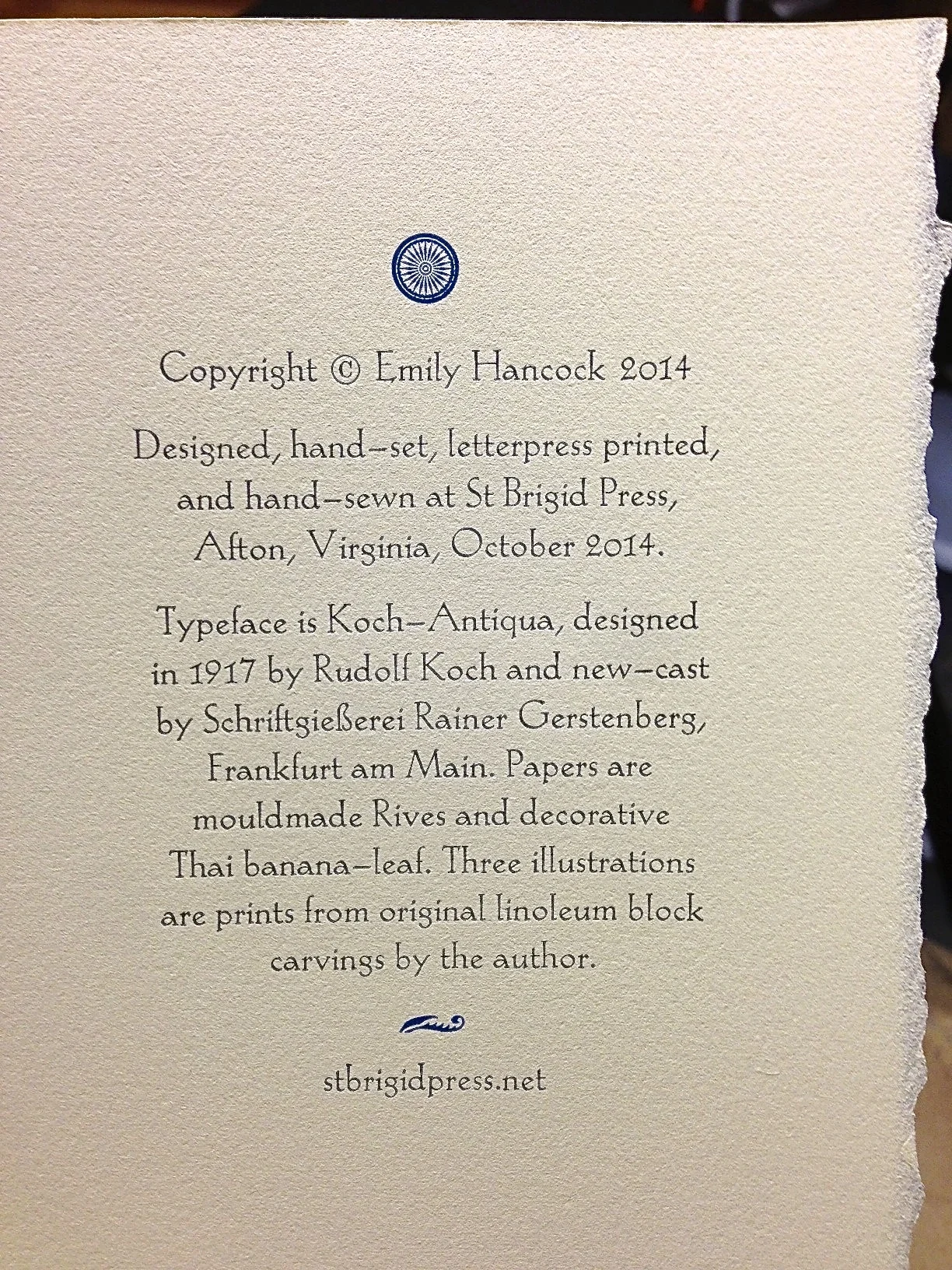 The beautiful Koch-Antiqua typeface, cast for us by Rainer Gerstenberg in Germany, here printed for the colophon of our limited edition book of poems, Soundings. Click the photo for more about Gerstenberg's foundry.