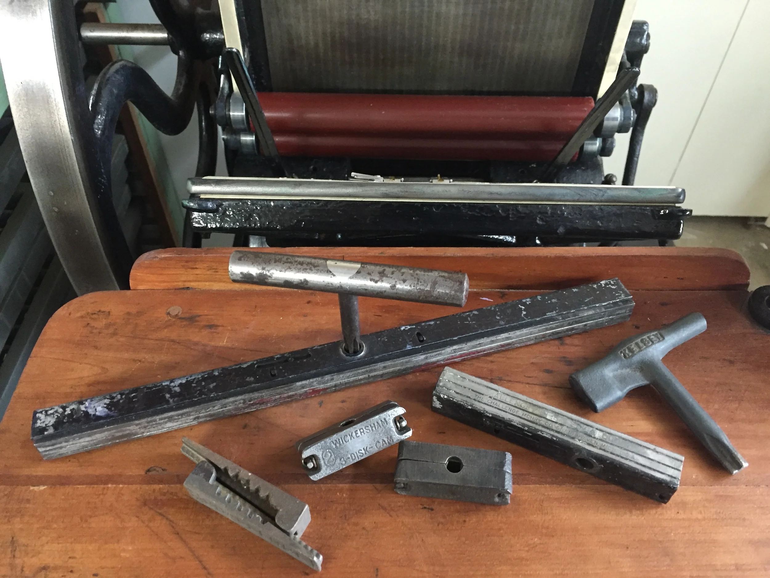 FURNITURE: Wooden or metal furniture is used to surround the block of type within the chase, taking up any extra space between type and chase edge. Wooden furniture, such as we use here at St Brigid Press, is traditionally made from kiln-dried hardwoods, and comes in standard sizes to fit the job.
