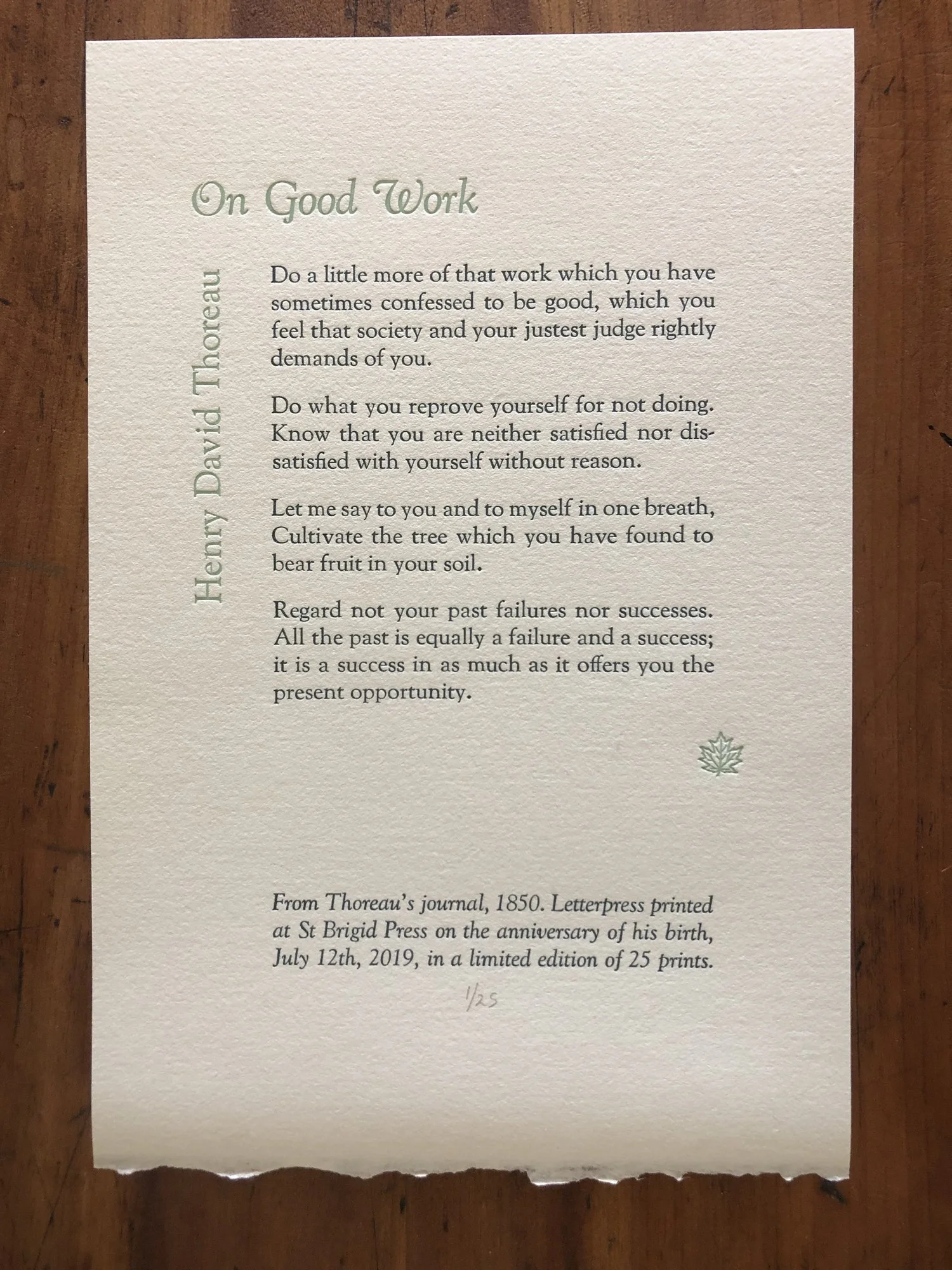 *ON GOOD WORK is an ongoing St Brigid Press chapbook series offering insights from artists of various disciples on the vast subject of human creative work — its process, ethics, aesthetics, and bodied nature. It is inspired by this text from the journal of Henry David Thoreau: