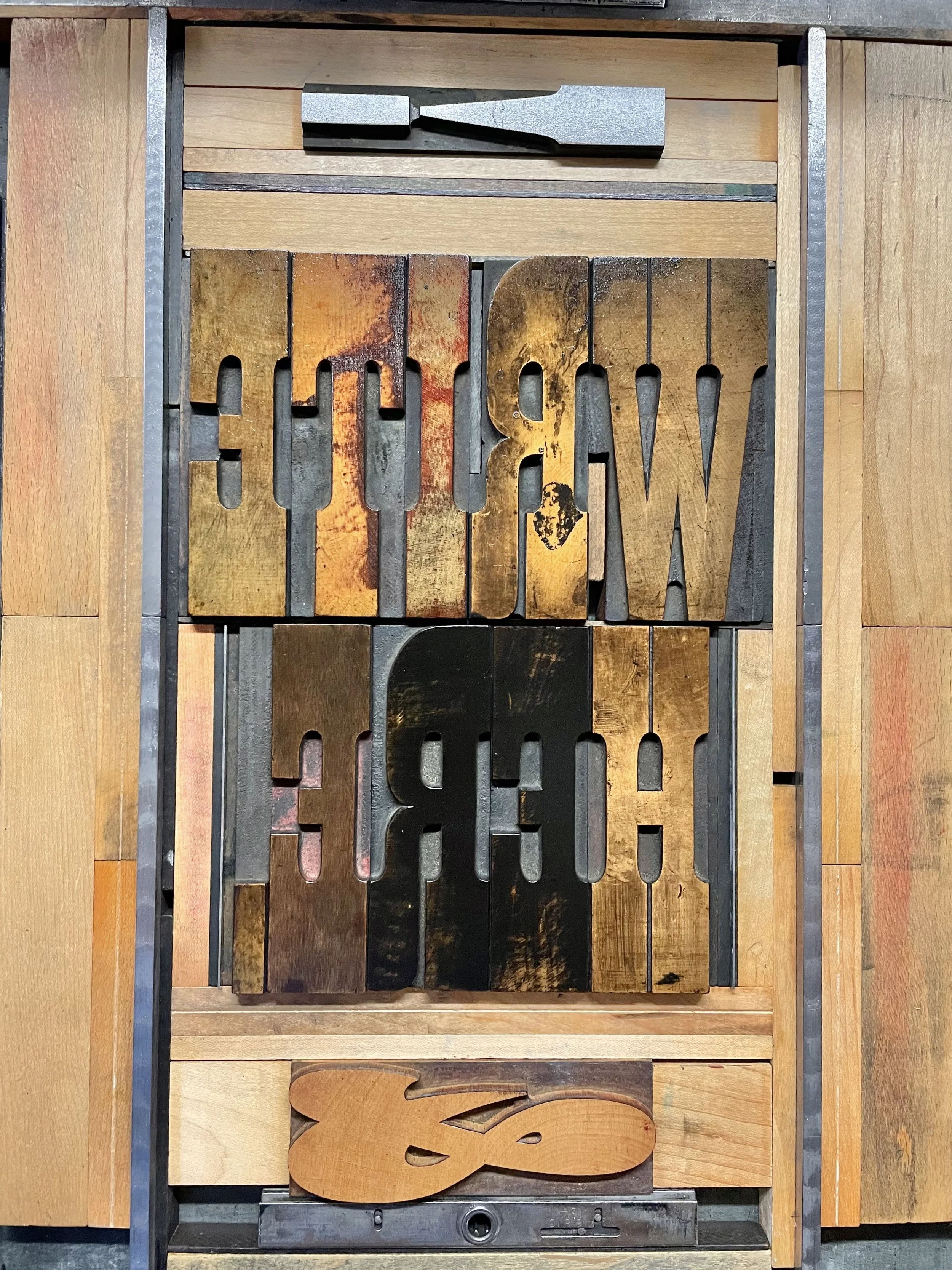 Here at St Brigid Press, we are honored to care for a wide range of vintage wood type. Most of it is well over a century old, like this 5”-tall French Clarendon made by Hamilton Wood Type in Two Rivers, Wisconsin, in the early 1900s. It was a delight to set this up on the press, roll a thick layer of transparent ink over it, and see the resulting print turn the jacket paper an even richer color. These make inspiring gifts for the journalers or jotters in your life — or grab one and let it serve your own creativity as you WRITE HERE!